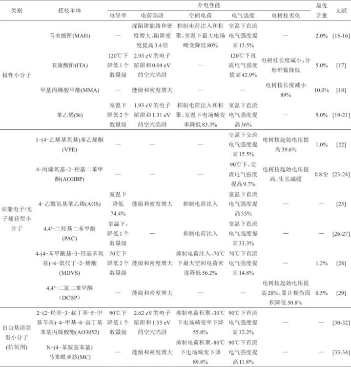 (1)极性小分子接枝单体分为含极性官能团接枝分子和含芳香环共轭结构接枝分子,能通过引入局域态深陷阱和调控球晶结构改善PP绝缘电气性能,但过量添加也会增大PP绝缘的介电损耗,对电缆绝缘产生不利影响。