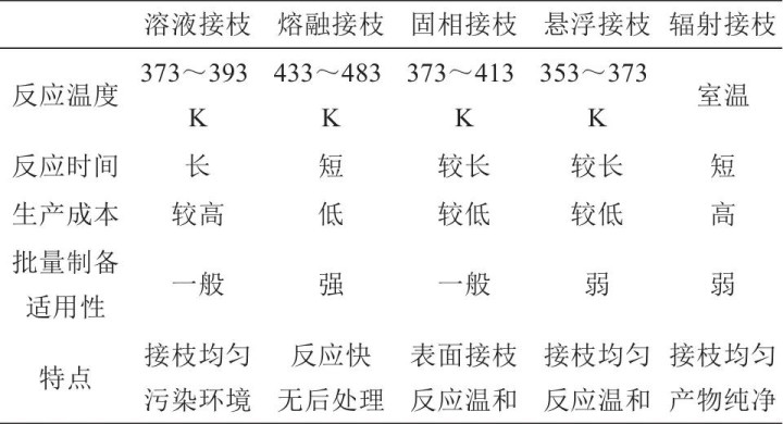 (2)化学接枝方法涵盖了溶液接枝、熔融接枝、固相接枝、悬浮接枝以及辐射接枝等多种方式。其中,熔融接枝法因其适用于大规模工业生产的特性而备受关注。然而,该方法中接枝单体与引发剂的含量、反应温度、时间以及转子转速等因素均对接枝效果产生显著影响。目前,针对不同接枝单体的最佳工艺条件仍有待进一步研究和优化。