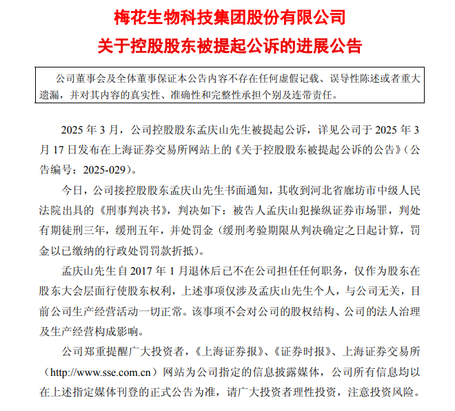 11月7日,梅花生物(600873)(600873.SH)发布公告显示,公司接控股股东孟庆山书面通知,其收到河北省廊坊市中级人民法院出具的《刑事判决书》,判决如下:被告人孟庆山犯操纵证券市场罪,判处有期徒刑三年,缓刑五年,并处罚金(缓刑考验期限从判决确定之日起计算,罚金以已缴纳的行政处罚罚款折抵)。